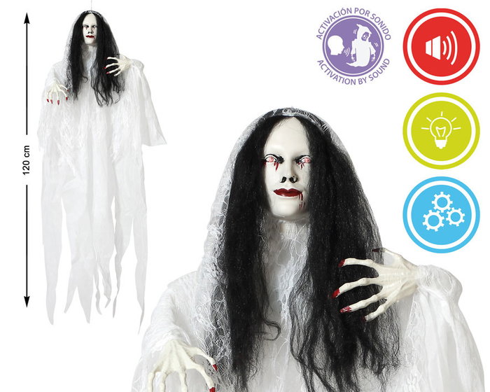 Décor Halloween Fantôme Mariée Blanche Longs Cheveux 120 cm Effets Lumière et Son