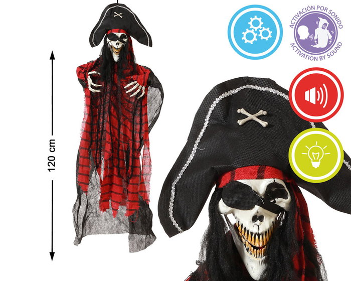 Squelette Pirate Décoratif Suspendu avec Chapeau, Lumière et Son, 120 cm - Figurine à Mettre en Mouvement par Son pour Halloween et Fêtes Thématiques
