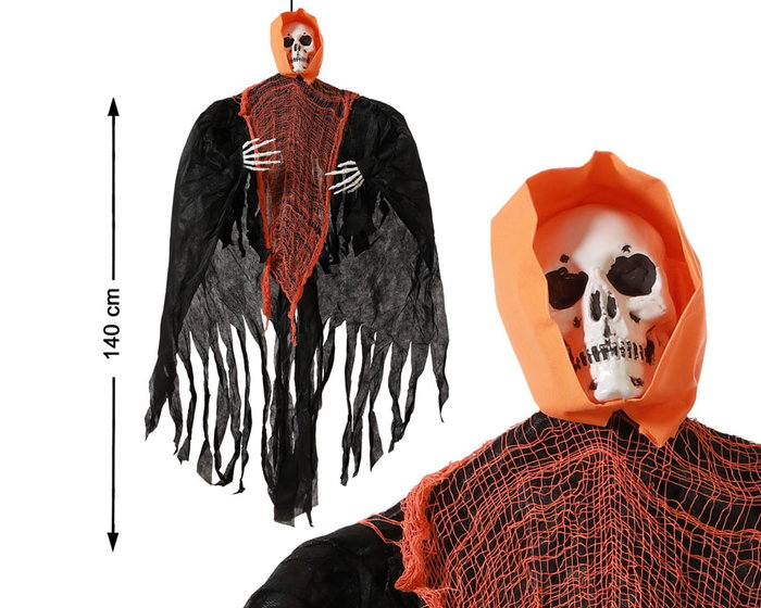 Ajoutez de la couleur et de l'effroi à votre décoration avec ce squelette suspendu au visage blanc et à la capuche orange. Parfait pour créer une atmosphère effrayante et festive. Idéal pour les fêtes, les vitrines ou les décorations d'Halloween, tant en intérieur qu'en extérieur.
