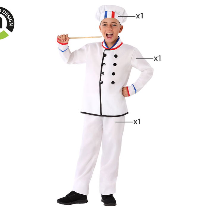 - Contenu du costume : Un chapeau de chef blanc, une veste blanche avec des détails décoratifs rouges et bleus, et un pantalon blanc.