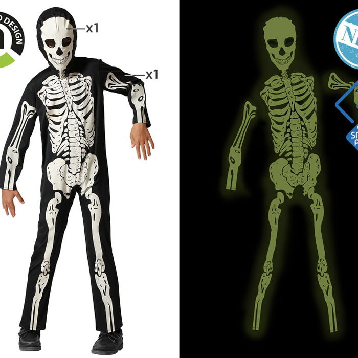 Déguisement de squelette enfant avec effet phosphorescent. Le costume inclut un masque anatomique pour un impact visuel maximal. Idéal pour les événements à thème, les défilés scolaires ou les soirées d'horreur où se faire remarquer est l'objectif.