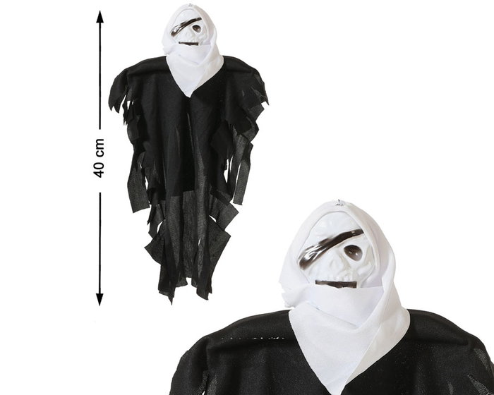 Transformez votre look avec ce spectaculaire costume de fantôme. D'une hauteur d'environ 40 cm, il comprend une cape noire avec des détails déchirés et un masque blanc qui ajoute une touche effrayante.