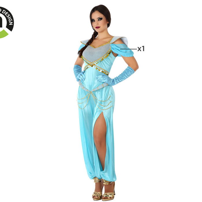 Vivez le conte des mille et une nuits avec ce fantastique costume de danseuse arabe pour femme en couleur bleu ciel. Transformez-vous en la plus belle princesse d'Arabie avec cet incroyable costume arabe pour femme. Il est composé d'une excellente robe bleu ciel avec une infinité de détails : des épaulettes et un plastron gris, des perles et des finitions dorées, et une jupe ouverte qui en laissera plus d'un sans voix.