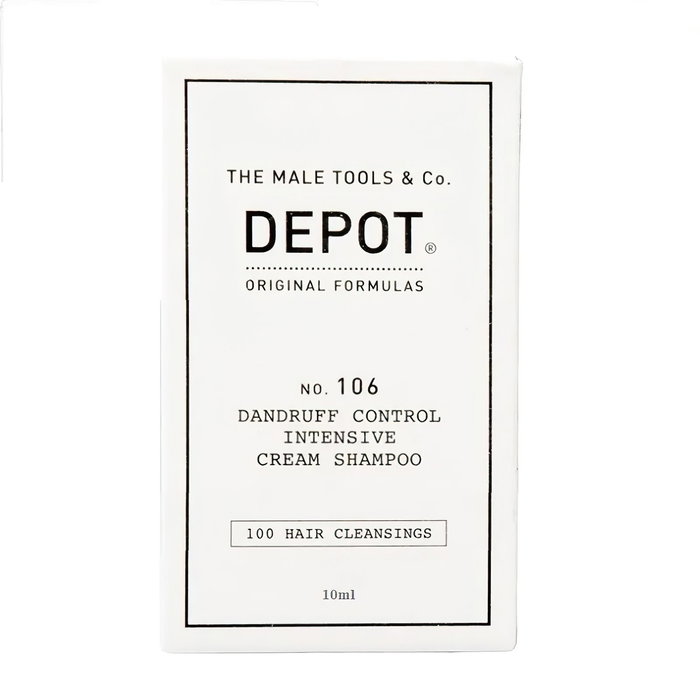 Shampooing antipelliculaire Depot 100 Hair Cleansing No. 106 avec provitamine B5, spécialement formulé pour les hommes. Ce soin capillaire en format voyage de 10 ml nettoie en profondeur le cuir chevelu et les cheveux tout en luttant contre les pellicules. Sa formule enrichie en provitamine B5 aide à renforcer la fibre capillaire. Produit d'origine italienne.