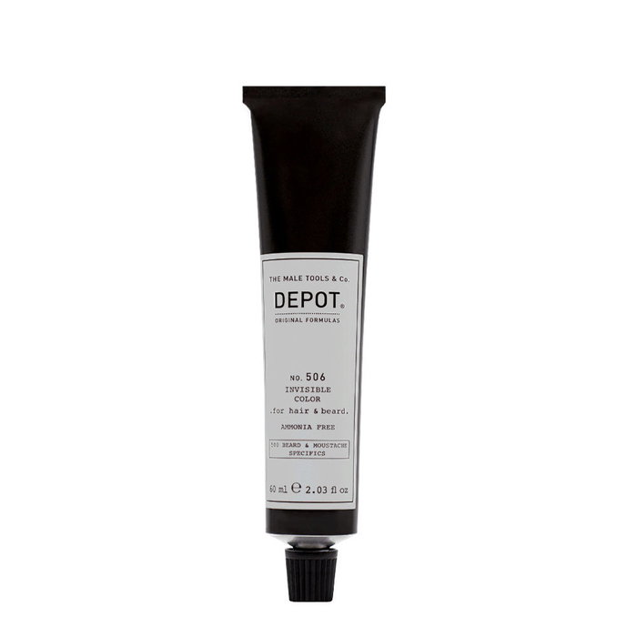 Teinture capillaire semi-permanente pour barbe et moustache Depot No. 506, couleur Natural Steel. Cette teinture invisible offre une coloration naturelle et discrète.