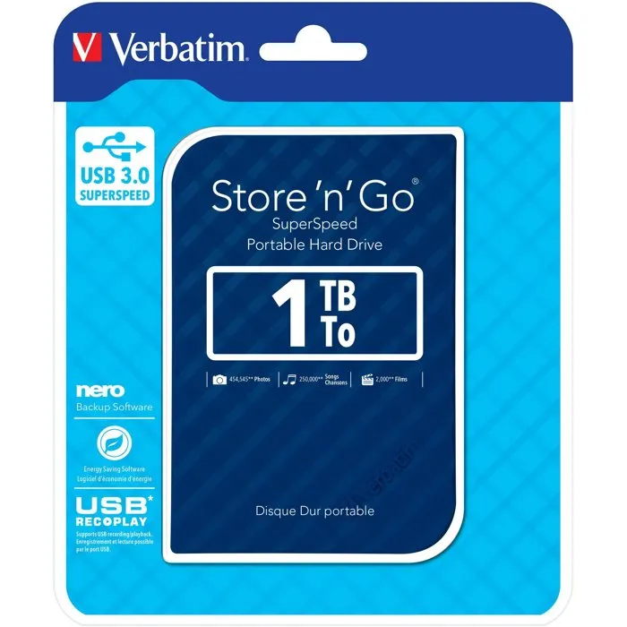 Verbatim Store'n'go - Disque dur externe portable 1 To Bleu - USB 3.0 - Alimentation par bus - Rétrocompatible USB 2.0