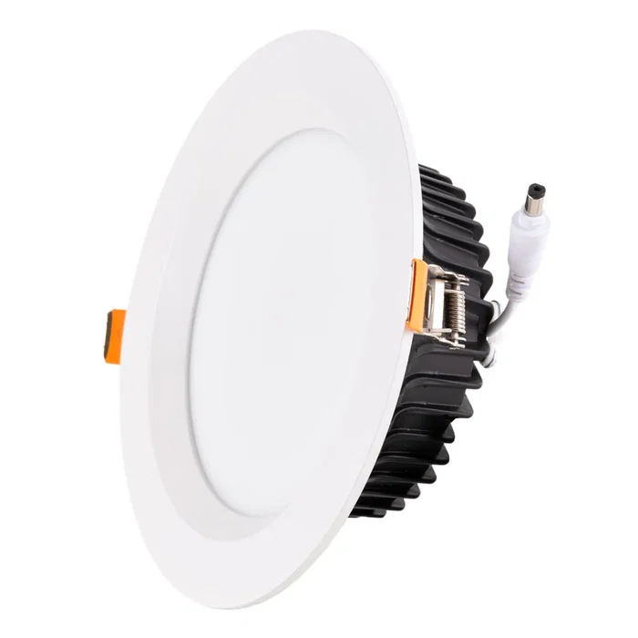 Ce downlight LED circulaire d'un diamètre de 190 mm, avec une épaisseur de 48 mm et un diamètre de découpe de 161 mm, offre des solutions d'éclairage pour intérieur comme pour extérieur. Il peut être installé directement sur les prises de courant du réseau électrique (85-265V AC) avec une fréquence de service de 50/60 Hz. Doté d'une haute efficacité lumineuse (90 Lm/W), il consomme 24W grâce à ses LED et fournit un flux lumineux de 2160 Lm, distribué uniformément par un diffuseur en plastique opalin, avec un indice de rendu des couleurs de 80. Il procure un éclairage équivalent à une ampoule à incandescence de 150W. Sa consommation s'élève à 24 kWh/1000h, permettant de réduire la facture énergétique et les émissions de gaz polluants. Ce downlight est livré avec un driver inclus dans le pack, à connecter directement au réseau, avec un connecteur de sortie compatible avec la connexion de la plaque (55-90V DC, 300mA). Les accessoires nécessaires pour l'installation de la plaque sont également inclus. De finition blanc et construit en aluminium, il possède un degré de protection IP65 (résistant à la poussière et aux jets d'eau, valable pour l'extérieur) et une robustesse adaptée aux exigences mécaniques. Fabriqué en PC et conçu pour une installation encastrée, ce spot LED est idéal pour les intérieurs, notamment les salles de bains et les pièces humides, ainsi que pour les extérieurs sous zones couvertes, grâce à son indice de protection IP65. Sa durée de vie utile est de 30 000 heures. Il est disponible en blanc froid (6000°K) et en blanc chaud (3000°K). La température de couleur indiquée peut présenter des oscillations correspondant à une tolérance de 7%.