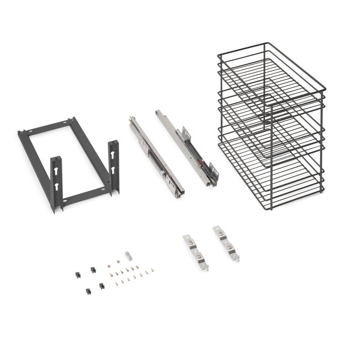 Il intègre des coulisses à rouleaux à extension totale et à fermeture douce, qui garantissent un fonctionnement en douceur, même avec des charges relevables. Son réglage lui permet de s'adapter aux différentes configurations de cuisine, garantissant une intégration parfaite dans n'importe quel design.
