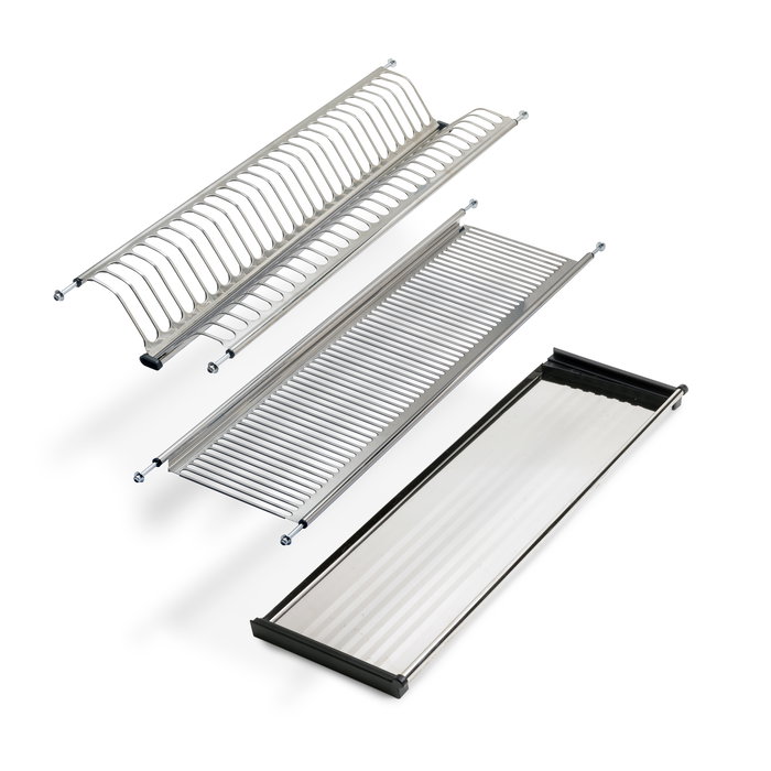 L'Égouttoir Drynox est la solution idéale pour organiser efficacement les assiettes et les conteneurs dans les meubles de cuisine hauts. Ce système complet comprend un plateau supérieur pour les assiettes, un plateau inférieur pour les conteneurs et un égouttoir amovible qui protège les unités de l'humidité et facilite le nettoyage.