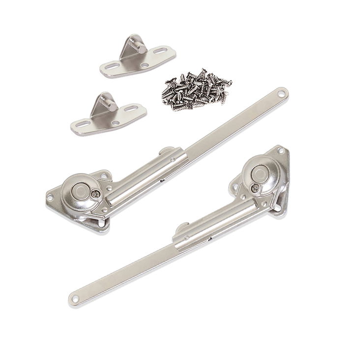 Jeu de compas pour meubles à portes relevables avec durabilité testée supérieure à 50.000 cycles d’ouverture/fermeture. Conçu pour amortir l’ouverture brusque des portes des meubles pour la cuisine, la maison et la salle de bain. La vitesse de la descente est réglée avec une vis. Contient une fixation pour porte en bois et les vis pour le montage. Fabriqués en acier et zamak avec finition nickelé.