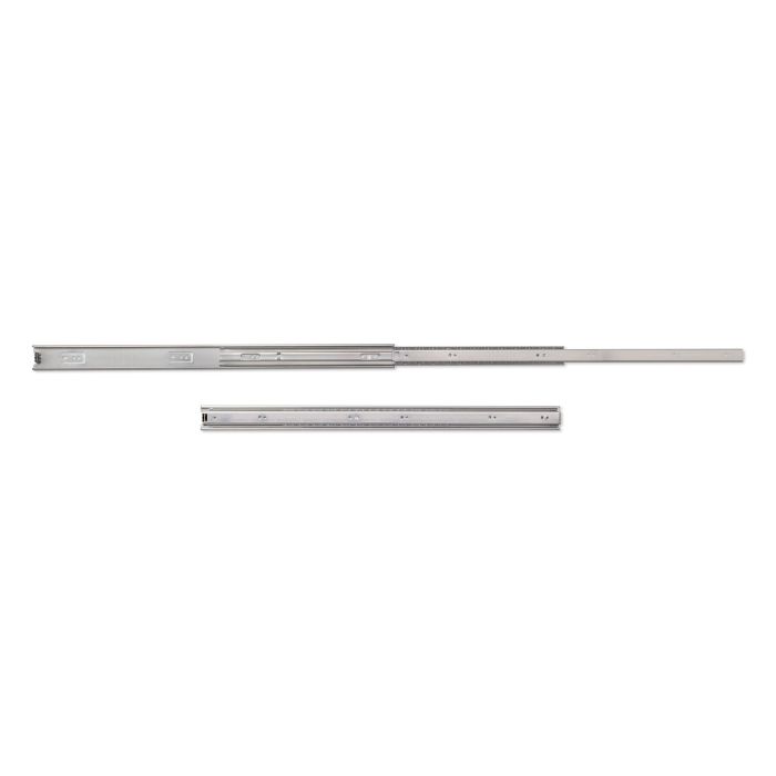 Coulisses à billes à sortie totale fabriquées en acier zingué. Guide de hauteur 45mm. Les vis de montage ne sont pas incluses. Avec gâchette pour le démontage. Charge maximum 30kg.