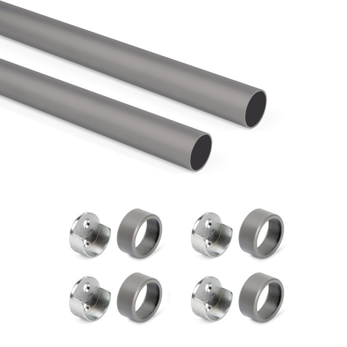 Le kit contient tout le nécessaire pour le montage de deux tubes de penderie d’armoire D. 28 mm : la barre, les supports latéraux et les vis de montage.