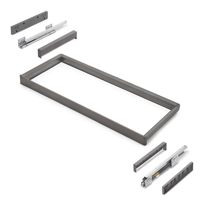 Le kit comprend tout ce dont vous avez besoin pour une installation rapide et soignée : 1 cadre, 1 jeu de coulisses, 1 jeu d'entretoises, 1 jeu d'enjoliveurs, 8 vis (Ø3,5x30 mm) et 4 vis (Ø4,5x20 mm), le tout dans un emballage soigné.