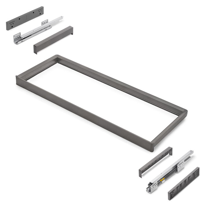 Le kit comprend tout ce dont vous avez besoin pour une installation rapide et soignée : 1 cadre, 1 jeu de coulisses, 1 jeu d'entretoises, 1 jeu d'enjoliveurs, 8 vis (Ø3,5x30 mm) et 4 vis (Ø4,5x20 mm), le tout dans un emballage soigné.