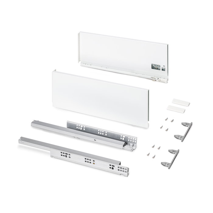 Le tiroir de cuisine et salle de bain Protone est disponible en kit avec toutes les ferrures nécessaires pour le montage et offre une grande capacité de charge, jusqu’à 30 kg par tiroir. Le kit contient les coulisses à sortie totale et fermeture amortie , un jeu de fixations et un jeu de côtés , disponibles en finition blanc ou gris anthracite. Vous n’aurez qu’à ajouter les panneaux pour le fond, la façade arrière et la façade du tiroir, avec les dimensions correctes.