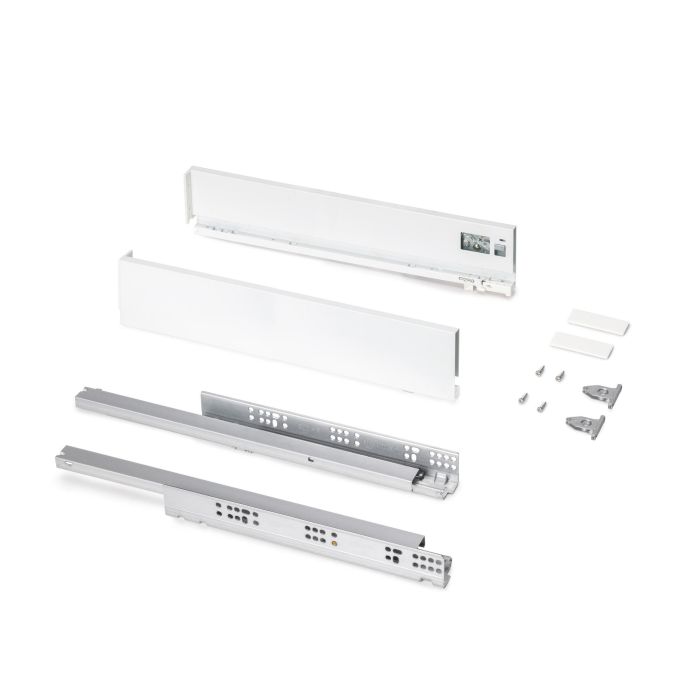 Le tiroir de cuisine et salle de bain Protone est disponible en kit avec toutes les ferrures nécessaires pour le montage et offre une grande capacité de charge, jusqu’à 30 kg par tiroir. Le kit contient les coulisses à sortie totale et fermeture amortie , un jeu de fixations et un jeu de côtés , disponibles en finition blanc ou gris anthracite. Vous n’aurez qu’à ajouter les panneaux pour le fond, la façade arrière et la façade du tiroir, avec les dimensions correctes.