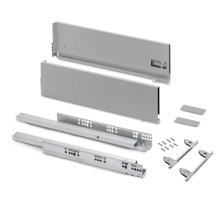 Kit pour tiroir de cuisine et salle de bain Vertex avec tous les éléments nécessaires à son montage. C'est la solution optimale pour vos meubles de cuisine, de salle de bain ou d'armoire avec un design élégant. Chaque kit est composé de tous les éléments nécessaires au montage d'un tiroir extérieur de hauteur 178mm, dimensionnées pour une épaisseur de panneau de 16mm pour le fond et l'arrière du tiroir. Comprend: deux côtés latérales, un ensemble de guides à fermeture amortie, un ensemble de couvre-garnitures et des attaches avant de tiroir.
