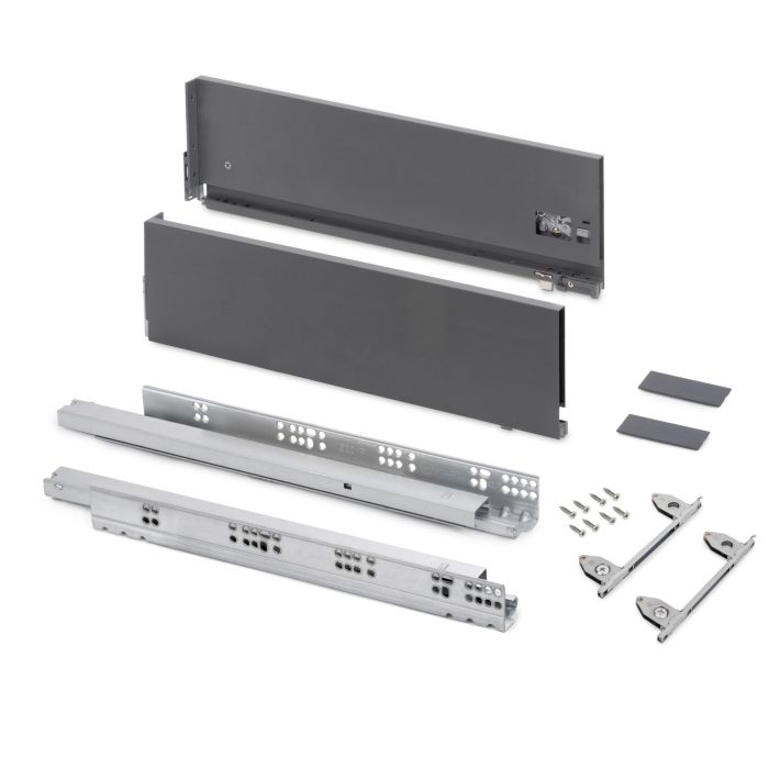 Les côtés latérales métalliques sont en acier avec finition peinte en gris anthracite, permettent d'un réglage frontal en 3D : vertical au moyen d'un excentrique de ±2 mm, horizontal ±1 mm, inclinaison -1,5/+4 mm. Les guides sont à sortie totale avec fermeture amortie et permettent une charge maximale de 60kg pour le tiroir.