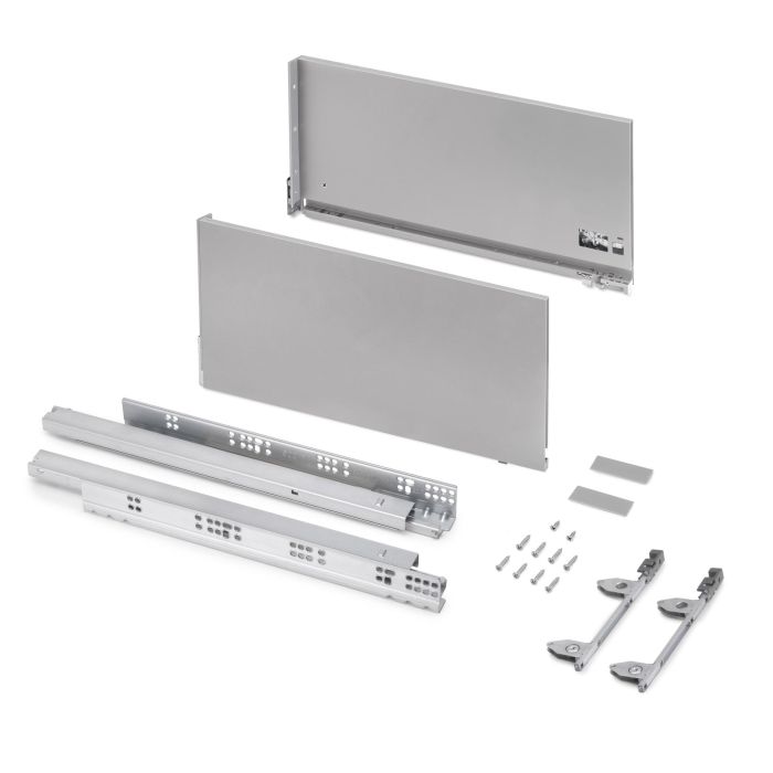 Chaque kit comprend tous les éléments nécessaires à l'assemblage d'un tiroir de 242 mm de haut, dimensionnées pour une épaisseur de panneau de 16 mm pour le fond et l'arrière du tiroir. Il comprend : deux côtes latérales, un jeu de coulisses à fermeture progressive, un jeu de couvercles et les fixations pour la façade du tiroir. Les coulisses sont des coulisses synchronisées à sortie totale avec fermeture en douceur, permettant une charge maximale de 60kg.
