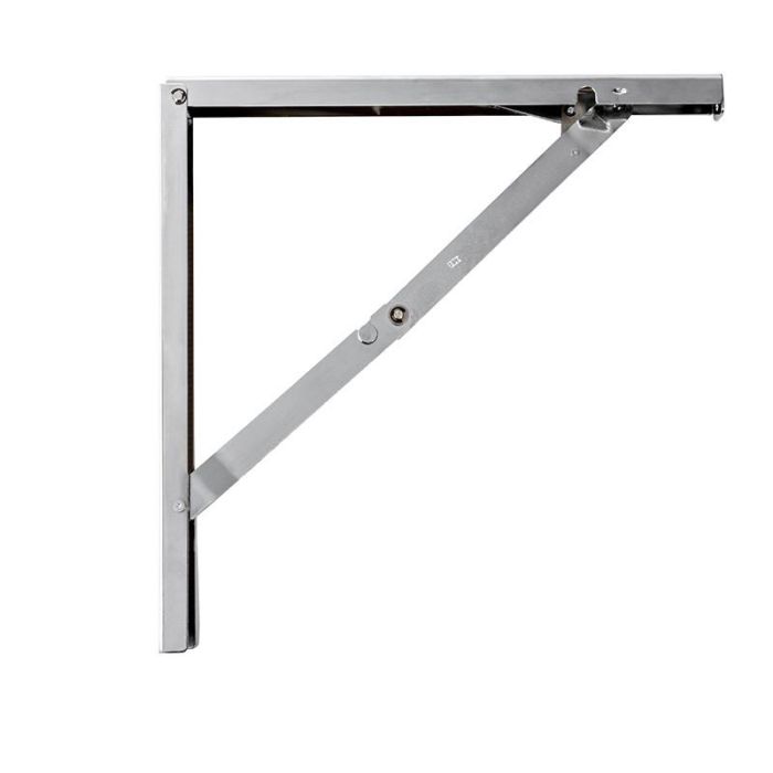 Está hecha en acero y se fija a la pared o estructura mediante tornillería. Se puede usar para mesas plegables, encimeras auxiliares o estanterías móviles.