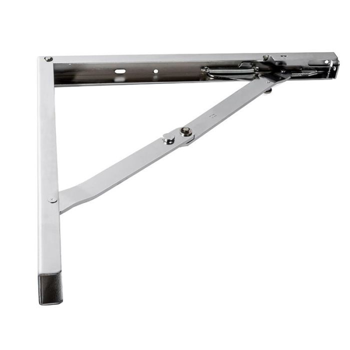 Está hecha en acero y se fija a la pared o estructura mediante tornillería. Se puede usar para mesas plegables, encimeras auxiliares o estanterías móviles.
