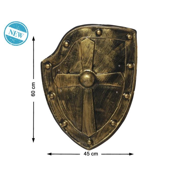 Défendez-vous avec style grâce à ce bouclier médiéval de 60 cm de largeur sur 45 cm de hauteur. Son design authentique, orné d'une croix et de rivets dorés, apporte une touche historique parfaite à tout costume de chevalier, croisé ou guerrier d'époque.