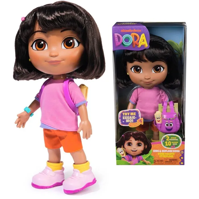 Une poupée Dora interactive pour jouer, chanter et faire des découvertes. Appuie sur ta poupée pour découvrir 2 chansons et 10 sons. Place le sac a dos tout moelleux sur le dos de Dora pour partir en mission découvertes. Avec une carte éducative incluse pour partir a l'aventure. Contenu de jeu bilingue français et anglais. Contenu : 1 poupée d'environ 30 cm, 1 sac a dos et 1 carte. Fonctionne avec 2 piles LR03 fournies. Boîte fenetre avec fonction démonstration. A partir de 3 ans.