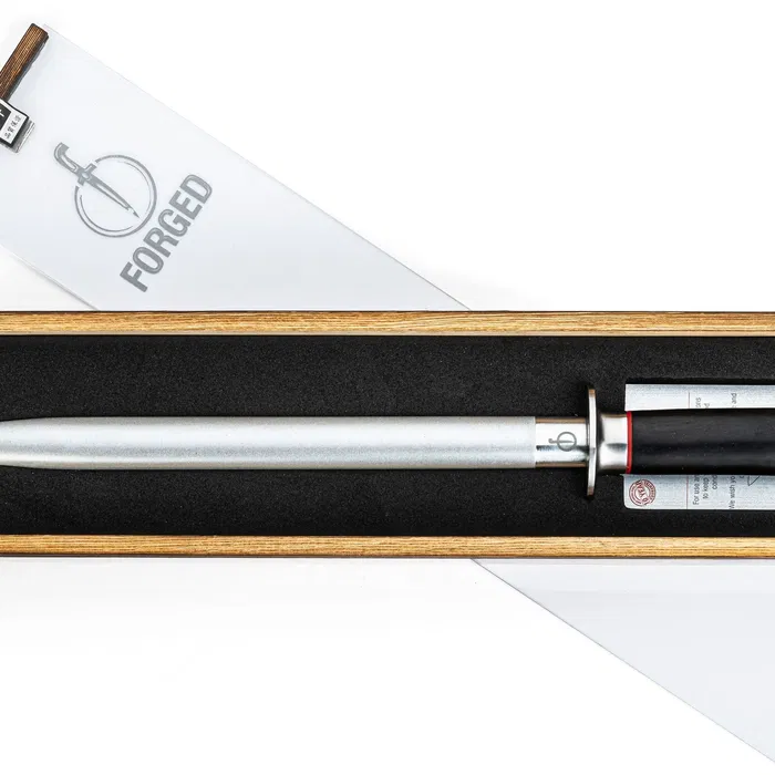 Le Diamant Sebra Sharpening Steel de la marque Forged est un acier a aiguiser pour bien entretenir vos couteaux Forged Sebra et les garder affûtés. L'acier a aiguiser est fabriqué a la main a partir d'acier japonais 440C et d'un manche en bois de Dalbergia melanoxylon, ce qui le rend tres solide et durable. L'acier a aiguiser garantit que les bavures sur le tranchant de votre couteau se déplacent dans la direction du tranchant. Cela permet de garder votre couteau tranchant. Tout ce que vous avez a faire est de passer toute la lame de votre couteau le long de l'acier a aiguiser a l'avant et a l'arriere. L'avant doit etre passé deux fois plus souvent le long de l'acier a affûter pour de meilleurs résultats. Cependant, il est important de toujours garder le couteau au meme angle. L'acier a aiguiser a une longueur de 26 cm, un poids de 430 grammes, est emballé dans une luxueuse boîte en bois et est livré avec une garantie de 10 ans.