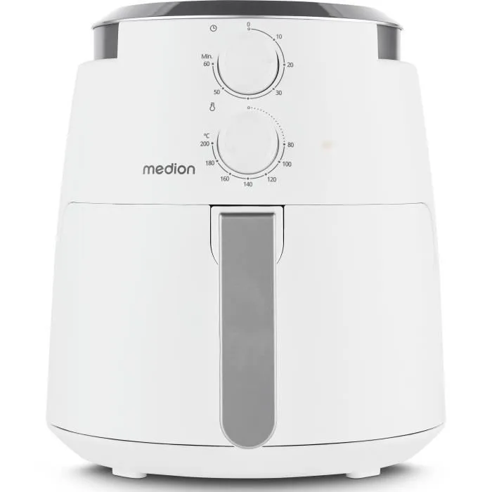 - Description du produit: Avec la friteuse à air chaud Medion Life MD13020, une alimentation saine devient très simple. La puissance de 1500 watts garantit une cuisson rapide et uniforme de vos plats. Avec une capacité de 4,7 litres, l'appareil est idéal pour les grandes portions, que ce soit pour vous seul, votre famille ou vos invités. La température réglable de 80 à 200 °C vous offre une flexibilité totale pour les recettes les plus diverses, des snacks croustillants aux plats principaux juteux. Grâce à la minuterie pratique de 60 minutes, vous pouvez vous détendre pendant que la friteuse à air chaud atteint le point de cuisson parfait. Et si vous avez besoin d'inspiration : dans l'application Medion Life+¹, vous trouverez 100 recettes gratuites que vous pourrez essayer directement. Votre entrée dans le monde de la cuisine saine et savoureuse commence ici !