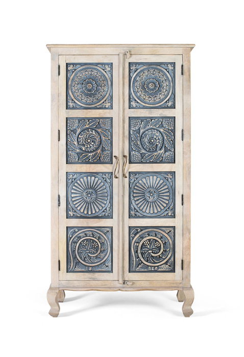 Armoire en bois de manguier avec portes sculptées à la main, décorées de panneaux en relief d'inspiration florale et géométrique. Chaque porte présente trois blocs aux motifs uniques sculptés et finis dans un ton bleu gris qui contraste élégamment avec le bois clair. L'intérieur comprend plusieurs étagères spacieuses pour un rangement polyvalent. Les pieds galbés de style cabriole et les poignées métalliques ajoutent une touche classique à cette pièce au caractère artisanal. Idéale pour les salons, chambres ou entrées, elle allie fonctionnalité et style rustique raffiné avec une touche exotique.
