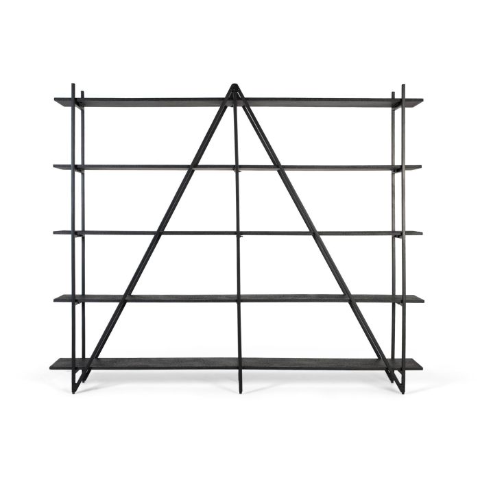 Cette bibliothèque présente un design moderne et architectural, alliant fonctionnalité et esthétique minimaliste de style industriel. Elle est composée d'une structure métallique et d'étagères en MDF, le tout d'une finition noire unie. Son design symétrique et sa structure ouverte apportent une touche contemporaine à votre intérieur tout en laissant librement circuler la lumière.