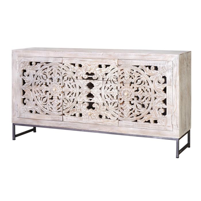 GINER Y COLOMER Buffet 2 portes et 3 tiroirs en bois de manguier et métal, finition blanc vieilli - Dimensions 80x150x38 cm