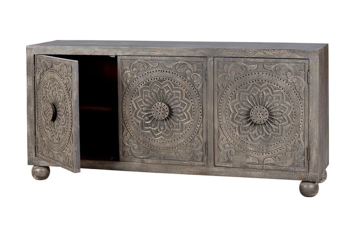 Buffet 3 portes fabriqué en bois de manguier, avec des détails des portes faits à la main. Doté d'étagères intérieures. Hauteur des pieds : 10 cm. Dimensions des portes : 62 x 53 cm. Hauteur de l'étagère intérieure : 29 cm. Finition gris lavé. Dimensions générales : 82 cm de hauteur x 172 cm de largeur x 43 cm de profondeur. Poids : 46 kg.