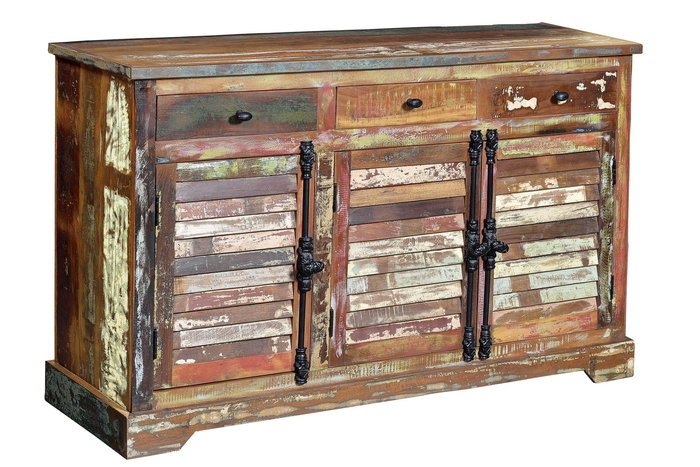 Ce magnifique buffet 3 portes avec trois tiroirs est entièrement réalisé en bois recyclé, issu du démantèlement de bateaux et de mobilier ancien. Ses portes arborent un design traditionnel majorquin, agrémenté de serrures à espagnolette et d'étagères intérieures. Une pièce unique, fabriquée de manière artisanale, qui peut présenter les nœuds et veines naturels du bois, ainsi que de légères variations de couleur, ajoutant à son caractère authentique.