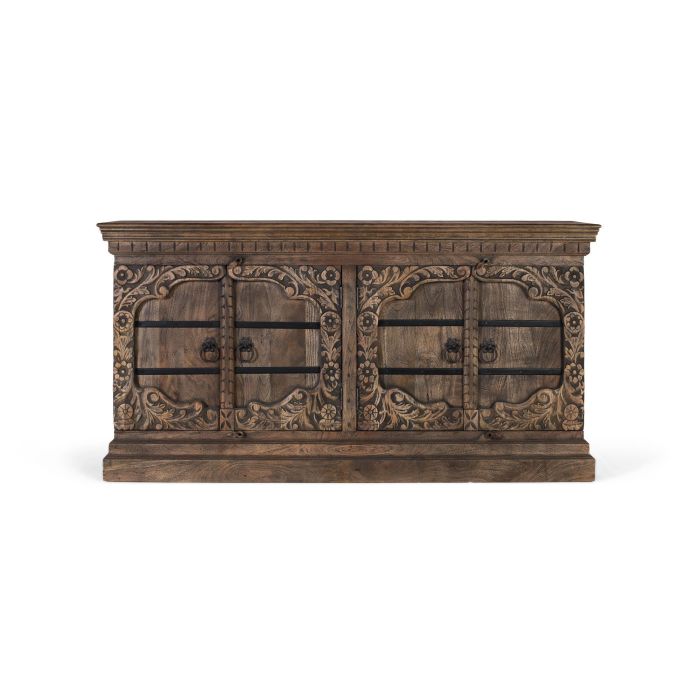 Ce buffet d'une grande présence est fabriqué en bois massif de manguier, avec un design robuste et élégant. Il comporte quatre portes frontales richement sculptées de motifs floraux et de cadres ornementaux. Les portes sont renforcées par des bandes métalliques horizontales et des poignées en anneau en fer vieilli. À l'intérieur, il intègre des étagères spacieuses pour un rangement optimal. La base incluse une plinthe périphérique surélevée, qui assure stabilité et une esthétique solide et équilibrée.