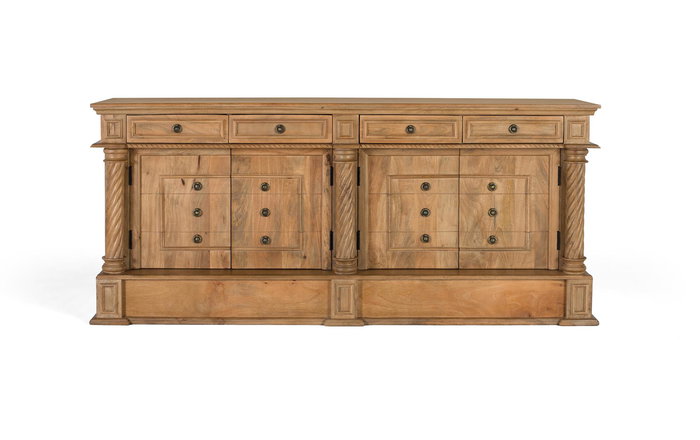 Buffet en bois de manguier de récupération, composé de 4 tiroirs et 4 portes. Chaque pièce, étant du bois récupéré et un meuble artisanal, peut présenter ses nœuds et veines d'origine, ce qui peut entraîner des variations naturelles de couleur.