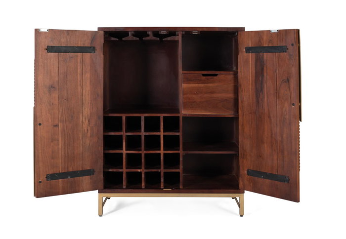 Ce meuble bar de deux portes est fabriqué en bois massif de manguier avec une base en métal, offrant une finition dans un chaleureux ton bois cerise. En tant que pièce en bois naturel et artisanale, il peut présenter des nœuds et des veines naturelles caractéristiques, ce qui peut entraîner de légères variations de couleur d'un exemplaire à un autre, ajoutant à son caractère unique.