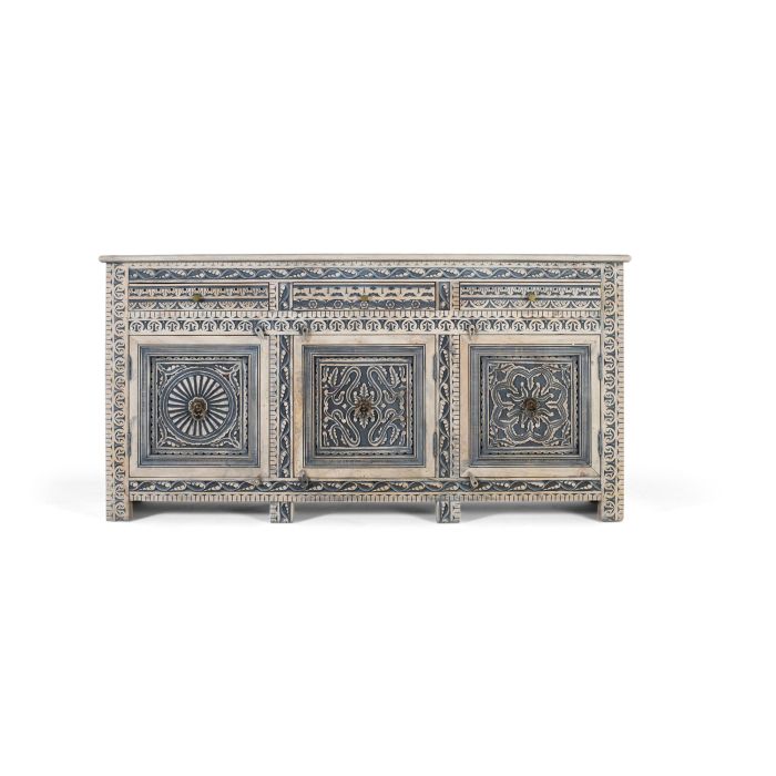 Ce buffet, fabriqué en bois de manguier robuste, se distingue par sa finition élégante en blanc lavé. Son design allie fonctionnalité et art. La partie supérieure du meuble présente trois tiroirs spacieux, alignés horizontalement, suivis par trois portes dans la partie inférieure offrant un large espace de rangement. La sculpture artisanale est mise en valeur par un fond dans un ton bleu profond, qui contraste avec le blanc lavé du reste du meuble, faisant vivre les reliefs et les mettant en valeur visuellement.