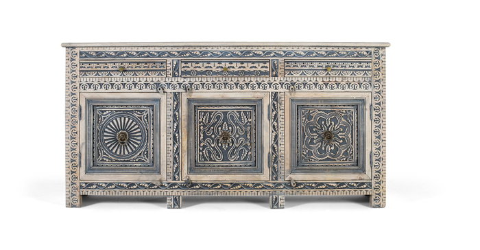 Cet élégant buffet, fabriqué en bois solide de manguier, se distingue par sa finition élégante en blanc lavé. Son design allie fonctionnalité et caractère artisanal. La partie supérieure du meuble comporte trois tiroirs spacieux, alignés horizontalement, suivis de trois portes dans la partie inférieure offrant un vaste espace de rangement. La sculpture artisanale est mise en valeur par un fond d'un bleu profond, qui contraste avec le blanc lavé du reste du meuble, faisant ressortir les reliefs et donnant vie aux détails.