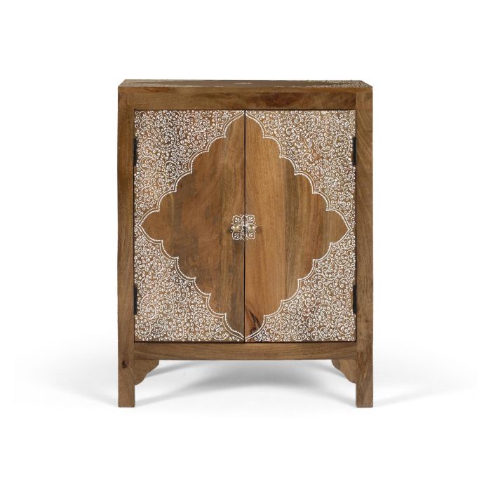 Meuble auxiliare fabriqué en bois massif de manguier, alliant un design sobre et élégant. Ses portes avant présentent un délicat travail artisanal en relief de couleur blanche, avec des motifs floraux finement tracés qui encadrent une forme centrale symétrique d'inspiration orientale. Le contraste entre la chaleur naturelle du bois et les détails blancs crée un effet visuel harmonieux et décoratif. Il est équipé de poignées métalliques ornementales, ce qui en fait une pièce idéale pour les espaces recherchant une touche artisanale et sophistiquée. Il s'intègre parfaitement dans des ambientes rustiques, ethniques ou contemporains.