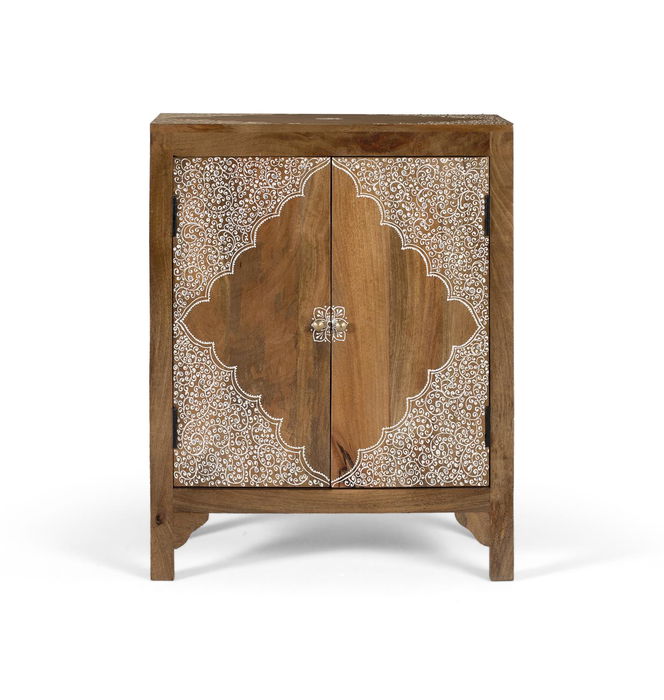 Meuble auxiliaire fabriqué en bois massif de manguier, avec un design sobre et élégant. Les portes avant présentent un délicat travail artisanal en relief blanc, avec des motifs floraux finement tracés qui encadrent une forme centrale symétrique d'inspiration orientale. Le contraste entre la chaleur naturelle du bois et les détails blancs crée un effet visuel harmonieux et décoratif. Avec des poignées métalliques ornementales, il est idéal pour les espaces recherchant une touche artisanale et sophistiquée, s'intégrant parfaitement dans des ambiances rustiques, ethniques ou contemporaines.