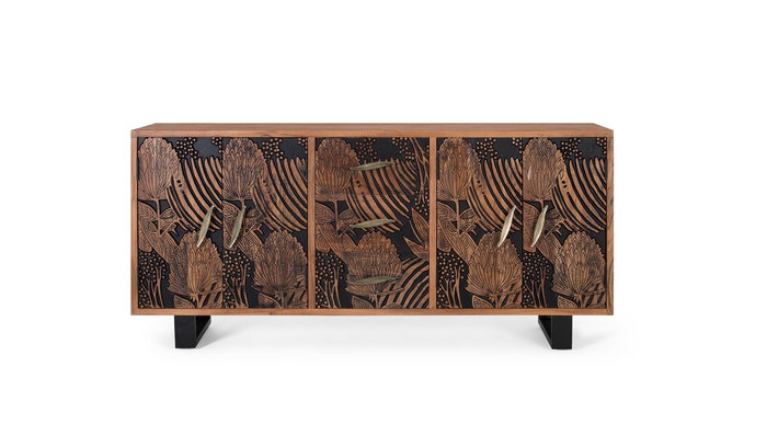 Fabriqué en bois massif d'acacia, ce buffet est une pièce artisanale unique. Les caractéristiques naturelles du bois, comme ses nœuds et ses veines, sont préservées, ce qui peut entraîner des variations de couleur et de texture d'un meuble à l'autre, ajoutant à son caractère authentique. Il est équipé de patins antidérapants pour protéger votre sol.
