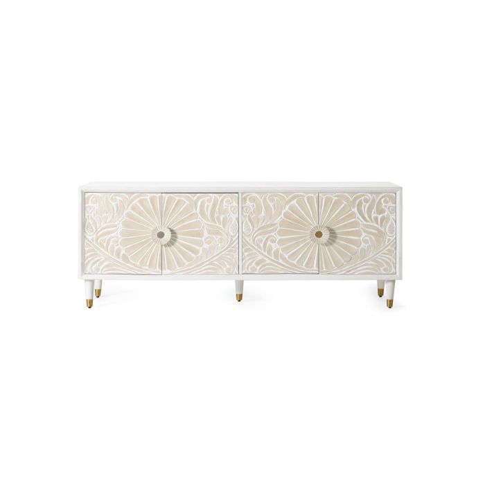 GINER Y COLOMER - Buffet TV 4 portes en bois de manguier blanchi, sculptures à la main, pieds avec anneau de bronze - 170x66x40 cm