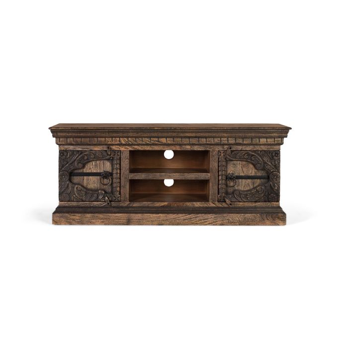 Meuble pour télévision fabriqué en bois de manguier massif avec finition vieillie. Il comporte deux portes latérales sculptées à la main avec des motifs ornementaux et des ferrures en fer forgé, qui apportent personnalité et style artisanal. Dispose d'un espace central ouvert avec deux étagères, idéal pour les équipements électroniques ou le rangement décoratif. Sa structure robuste et son design aux lignes solides en font une pièce fonctionnelle et décorative.