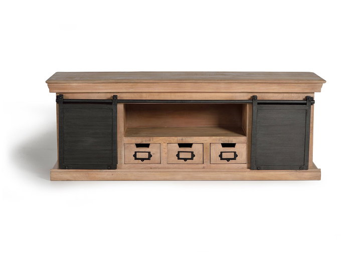 Meuble TV en bois massif de manguier avec portes coulissantes en fer