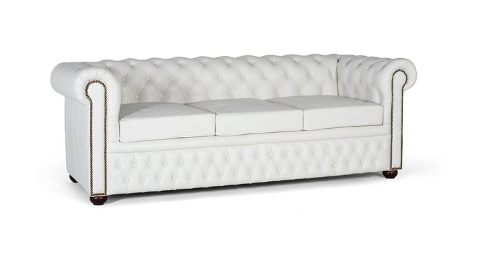 Ce canapé Chester trois places en cuir blanc allie design élégant et intemporel. Son capitonnage apporte une touche de sophistication et offre une texture matelassée et luxueuse au toucher. Avec ses lignes structurées et ses bras légèrement surélevés, ce canapé combine confort et style pour devenir une pièce maîtresse distinctive dans votre intérieur.