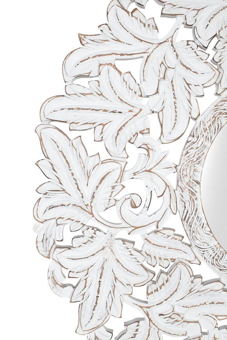 Ce miroir rond, sculpté à la main sur MDF, est une pièce qui allie délicatesse artisanale et un design aux influences culturelles riches. Le fini en patine blanche met en valeur son travail élaboré. Idéal pour ajouter une touche exotique et sophistiquée à tout espace.