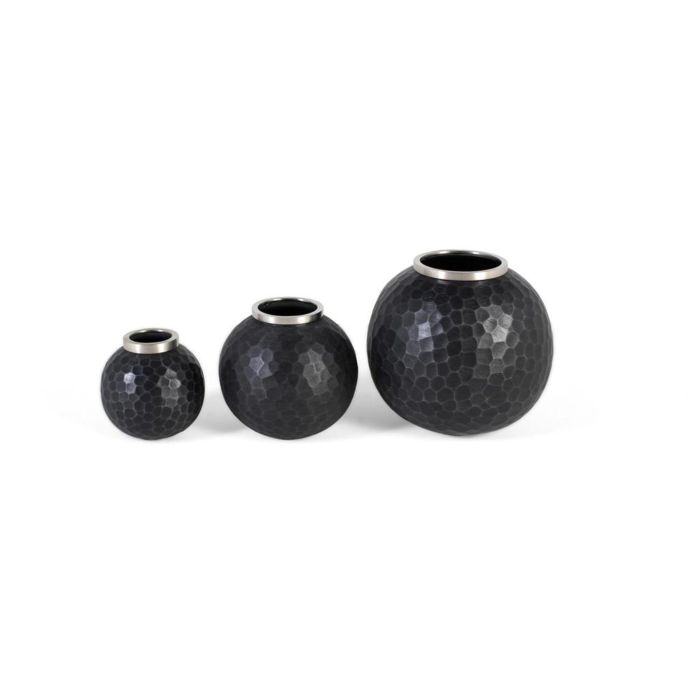 Jeu de trois vases décoratifs au design moderne, fabriqués en métal avec une finition gris anthracite. Leur forme ronde et équilibrée apporte une touche chaleureuse et polyvalente à votre intérieur. La surface est ornée d'un effet martelé qui ajoute de la texture et un charme artisanal, créant un contraste subtil avec le fini lisse de la couleur gris foncé.