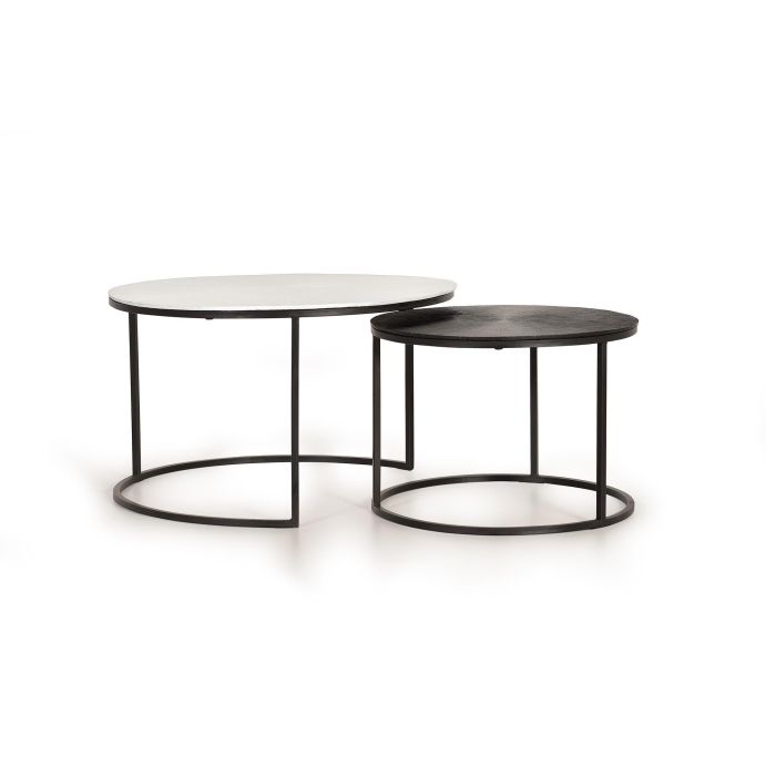 GINER Y COLOMER Lot de 2 tables basses en bois et métal, finition bronze et fer, plateau blanc et noir, diam. 45/76 cm et 40/56 cm
