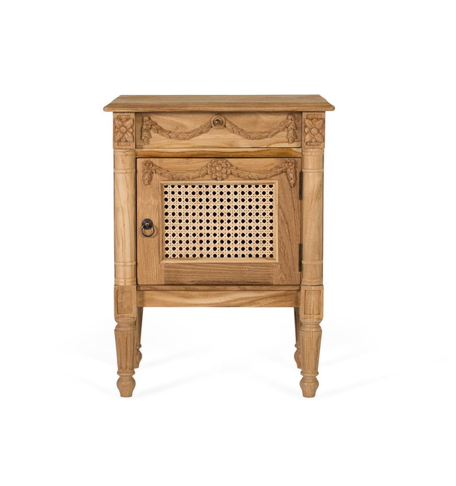 Petite table de chevet fabriquée en bois massif de teck avec un finition naturelle, qui met en valeur la veinure et la teinte chaude du matériau. Elle présente un tiroir supérieur avec une sculpture décorative de guirlandes et une porte inférieure en grille de rotin tressé, encadrée par des détails floraux sculptés à la main. Les pieds tournés et cannelés complètent un design classique et élégant, avec une touche artisanale et raffinée. Idéale comme pièce d'appoint dans des espaces de style rustique, provençal ou vintage naturel.